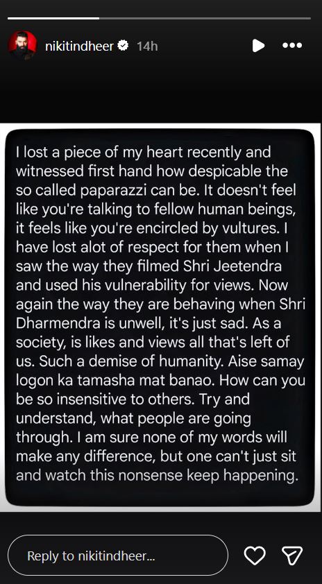 Condemning the paparazzi’s coverage of Dharmendra’s health, Nikitin wrote on Instagram, “I lost a piece of my heart recently and witnessed first-hand how despicable the so-called paparazzi can be. It doesn’t feel like you’re talking to fellow human beings, it feels like you’re encircled by vultures. I have lost a lot of respect for them when I saw the way they filmed Shri Jeetendra and used his vulnerability for views.”