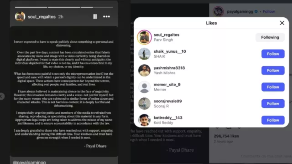 On December 17, 2025, Payal released a statement breaking her silence on recent problems concerning her. Her reported boyfriend, Parv Singh, quickly liked the post. Not only that, but he mirrored Payal’s post on his Instagram story, expressing his support in her honour.