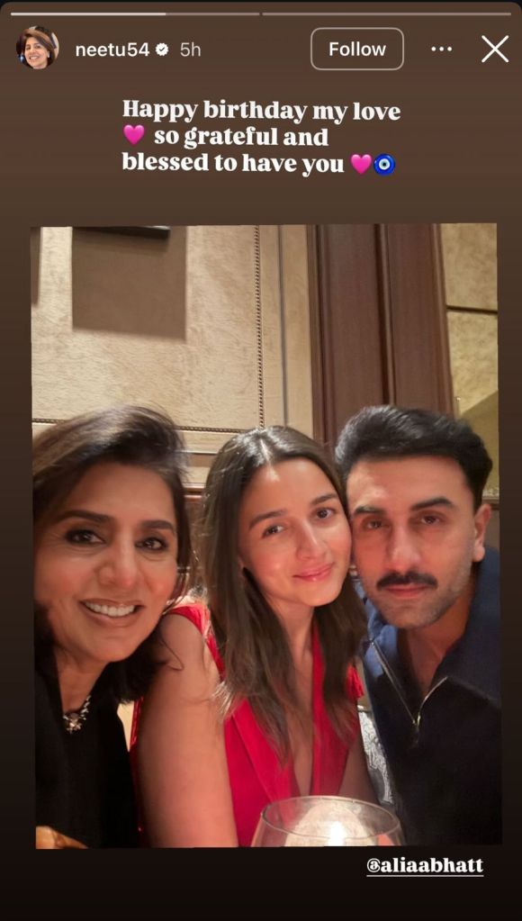 His mother Neetu Kapoor, shared a rare, adorable picture featuring Ranbir and Alia Bhatt, capturing a candid family moment. Alongside the photo, she wrote, “Happy birthday my love. So grateful and blessed to have you.”