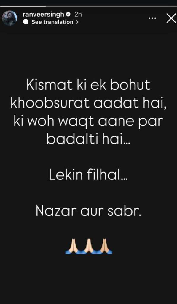 Amid the film’s historic box office run, Ranveer Singh took to his Instagram Stories on Monday, December 15, to share a note expressing gratitude. He wrote, “Kismat ki ek bohut khoobsurat aadat hai, ki woh waqt aane par badalti hai… Lekin filhal… Nazar aur sabr.”