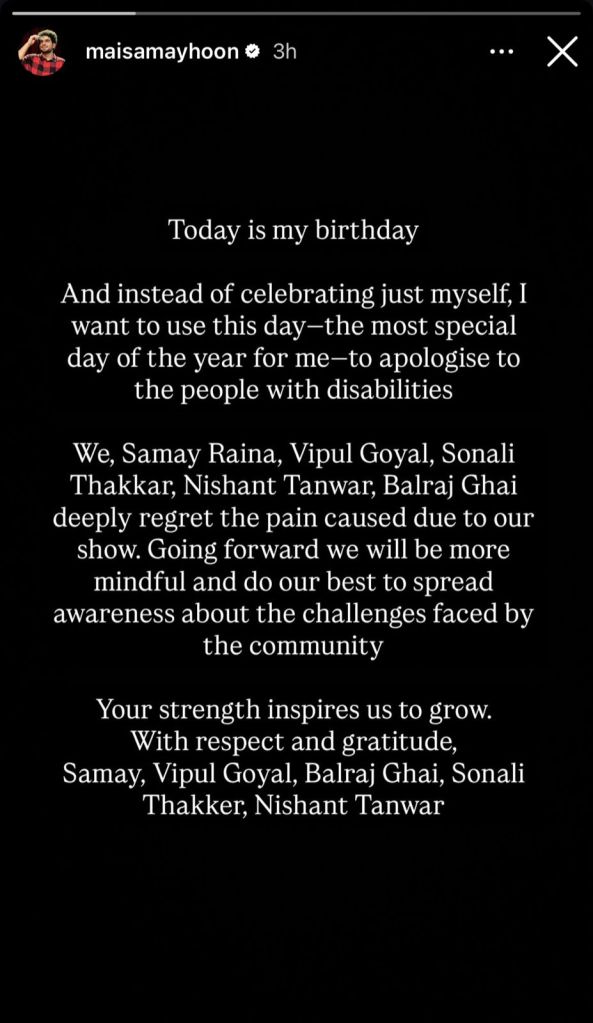 “We, Samay Raina, Vipul Goyal, Sonali Thakkar, Nishant Tanwar, Balraj Ghai, deeply regret the pain caused due to our show. Going forward, we will be more mindful and do our best to spread awareness about the challenges faced by the community. Your strength inspires us to grow. With respect and gratitude, Samay, Vipul Goyal, Balraj Ghai, Sonali Thakkar, Nishant Tanwar,” he further added.