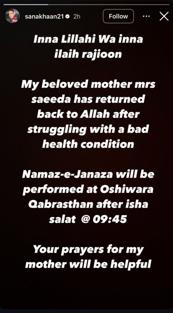 Former actress and Bigg Boss 6 contestant Sana Khan took to her Instagram Stories to share the heartbreaking news of her mother’s passing. In an emotional message, she wrote: