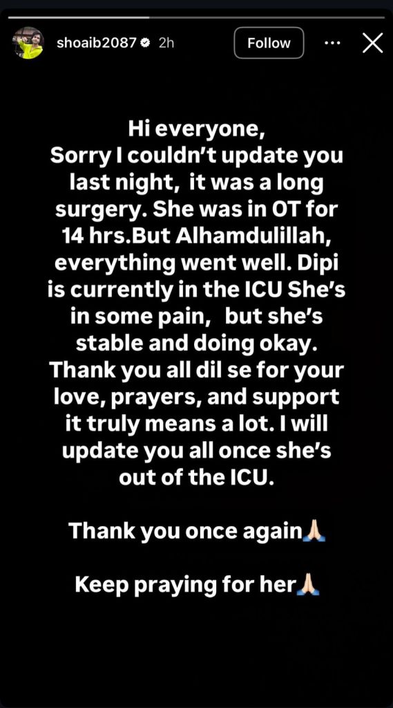 Shoaib expressed gratitude to fans while asking for continued prayers, “Hi everyone, Sorry I couldn’t update you last night, it was a long surgery. She was in OT for 14 hrs. But Alhamdulillah, everything went well. Dipi is currently in the ICU.”