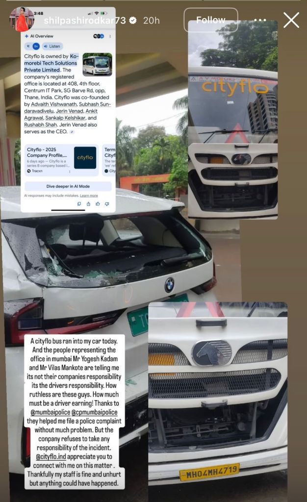 Actress Shilpa Shirodkar had an unexpected experience on Wednesday when her car was hit by a Cityflo bus in Mumbai. Sharing the incident on Instagram, she said that no one was injured in the accident, but the collision caused extensive damage to her car. A large dent and a broken window were seen at the rear of the car. She expressed her anger at the attitude of the transport company and said that the company representatives, Mr. Yogesh Kadam and Mr. Vilas Mankote, refused to take responsibility and instead shrugged it off by saying that the fault was entirely the driver’s.