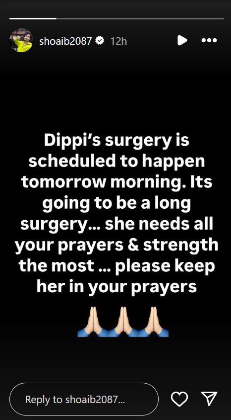 “Dippi’s surgery is scheduled to happen tomorrow morning. Its going to be a long surgery… she needs all your prayers & strength the most … please keep her in your prayers,” Shoaib wrote in his Instagram story.