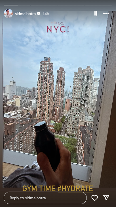 Sidharth Malhotra showed how serious he is about fitness by going to the gym soon after reaching New York City. He posted a photo on his Instagram story showing the beautiful New York City skyline through a window. In the picture, he’s holding a water bottle and wrote, “Gym time #hydrate.” He also added, ‘Hello NYC! In another photo, he gave fans a look at his ‘leg day’ workout.