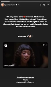 Jennifer Ariston took to her Instagram story and reacted to Cara’s death. She wrote, “Oh boy Irene Cara [heartbreak emoji]. That movie. That song. That VOICE. That school. Those kids. Innocent and the whole world right in front of them. All of it sent me on my path. I was in. Sold. Hook line and sinker. RIP Irene.”