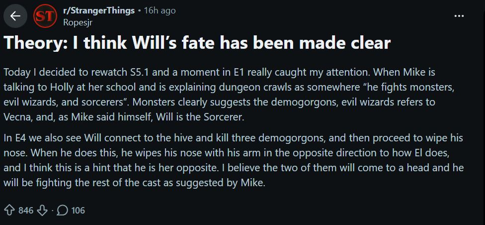 According to this wild fan theory on Reddit, Will might turn into a villain. The Reddit user shared that Mike’s speech to Holly, where he says, “he fights monsters, evil wizards, and sorcerers”, might be the ending of the series. Monsters are demogorgons, evil wizard is Vecna and the sorcerer is shown to be Will at the end of the fourth episode.