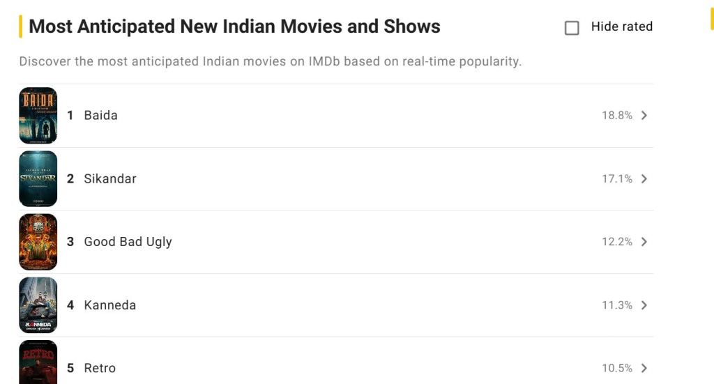 Baida has topped the list of ‘Most Anticipated Indian Movies And Shows Of 2025’ and left Salman Khan-starrer ‘Sikandar’ behind. Sikandar is at the second position, followed by Good Bad Ugly, Kanneda, Retro, Saaree, L2, Khakee: The Bengal Chapter, Kannappa and Mad Square.