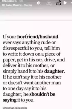 “If your boyfriend/husband ever says anything rude or disrespectful to you, tell him to write it down on a piece of paper, get in his car, drive, and deliver it to his mother, or simply hand it to his daughter. If he can’t say it to his mother or doesn’t want another man to one day say it to his daughter, he shouldn’t be saying it to you.”