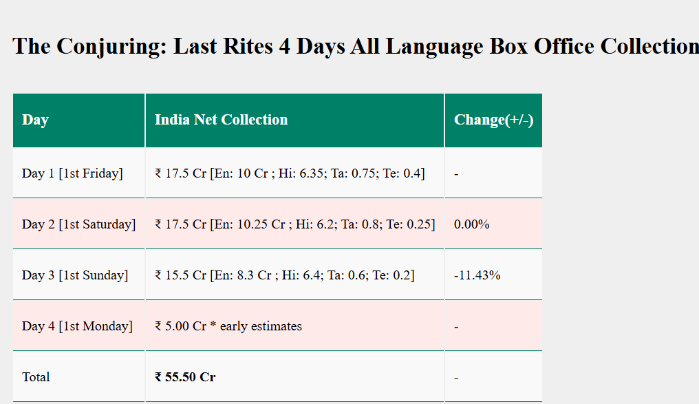As per Sacnilk’s early estimates, The Conjuring: Last Rites grossed Rs 5 crore on its first Monday to take its total gross to Rs 55.50 crore. The film has taken a sizable hit after its opening weekend but I suspect the public’s interest in the film will still linger for quite a while. The horror film has been dubbed into Hindi and Tamil as well.