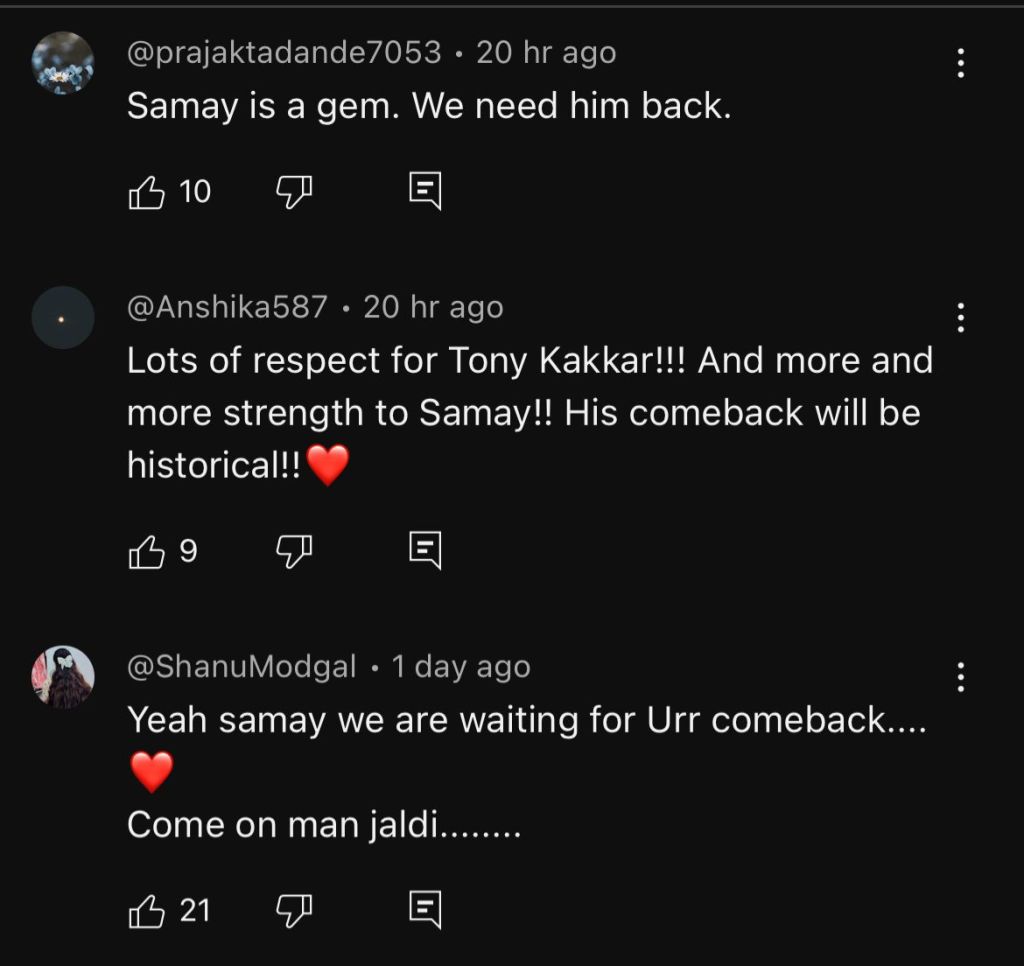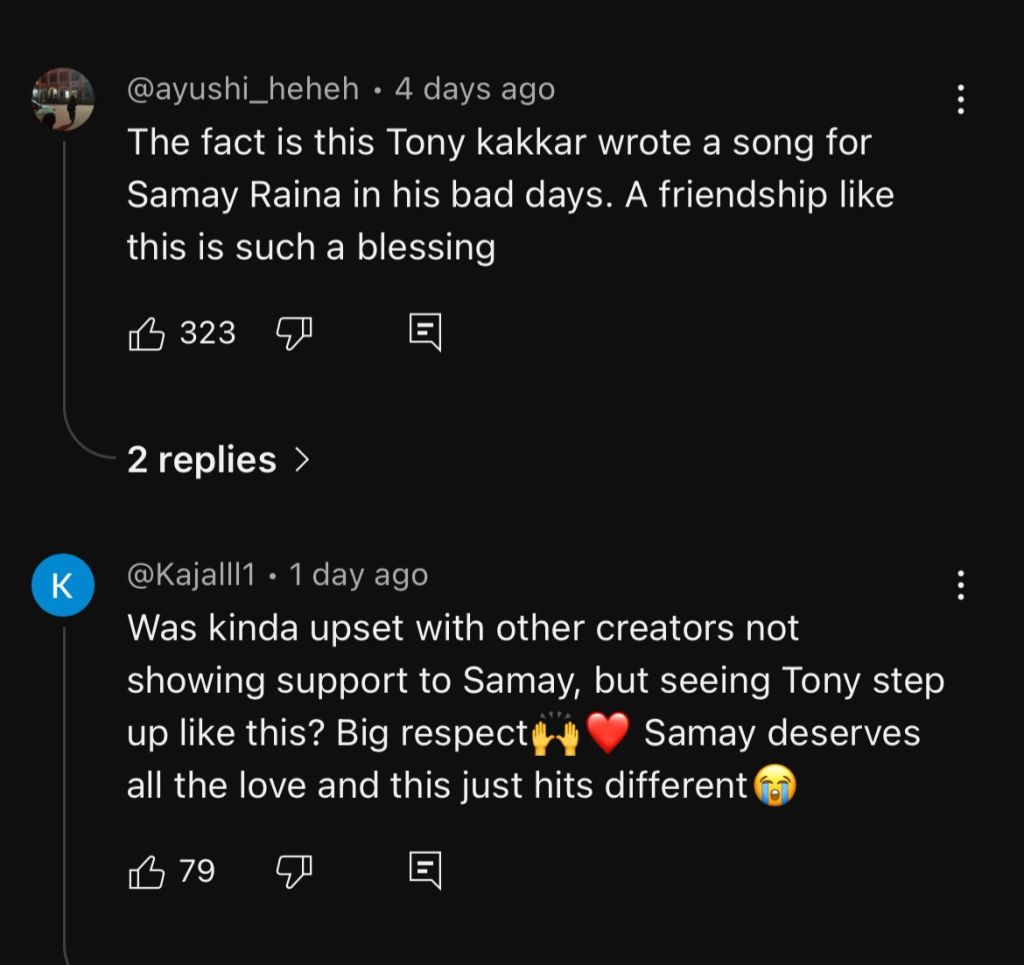 Fans have responded positively to Tony’s gesture of solidarity, with comments praising their friendship. One user wrote “Tony Kakkar wrote a song for Samay Raina in his bad days. A friendship like this is such a blessing.”