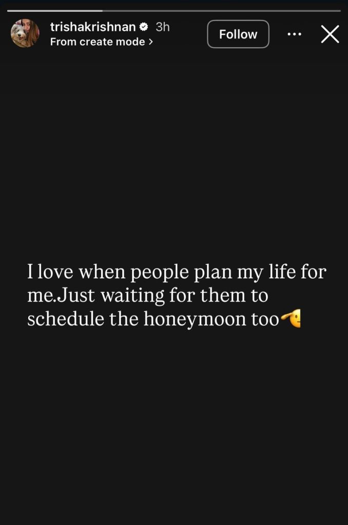 Taking to her Instagram Stories, Trisha wrote, “I love when people plan my life for me. Just waiting for them to schedule the honeymoon too (fed up emoticon).”