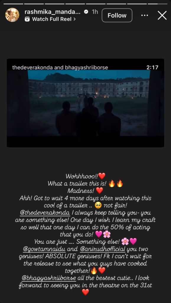 Rashmika took to her Instagram stories shortly after the trailer release to heap praise on Vijay’s performance. Sharing the trailer, she wrote, “Wohhhooo!! What a trailer this is! Madness! Ahh! Got to wait 4 more days after watching this cool of a trailer..not fair! @thedeverakonda I always keep telling you- you are something else! One day I wish I learn my craft so well that one day I can do the 50% of acting that you do! You are just …. Something else!”