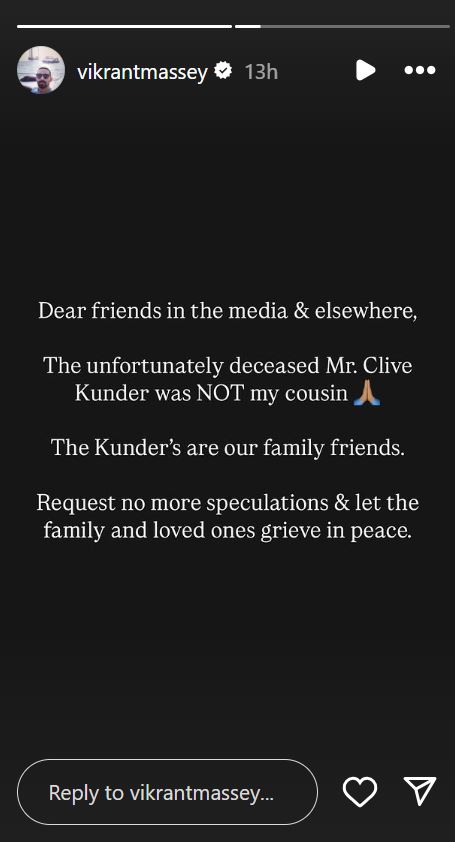 Many people misunderstood that Clive was Vikrant’s cousin but he issued a clarification. He added, “Dear friends in the media & elsewhere, The unfortunately deceased Mr Clive Kunder was NOT my cousin. The Kunder’s are our family friends. Request no more speculations & let the family and loved ones grieve in peace.”