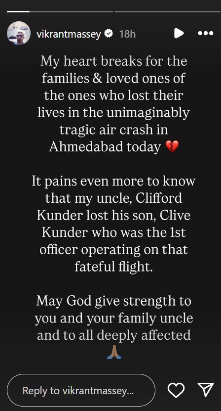 In his Instagram story, Vikrant Massey shared an emotional message and wrote, “My heart breaks for the families and loved ones of the ones who lost their lives in the unimaginably tragic air crash in Ahmedabad today. It pains even more to know that my uncle, Clifford Kunder lost his son, Clive Kunder, who was the first officer operation on that fateful flight.”