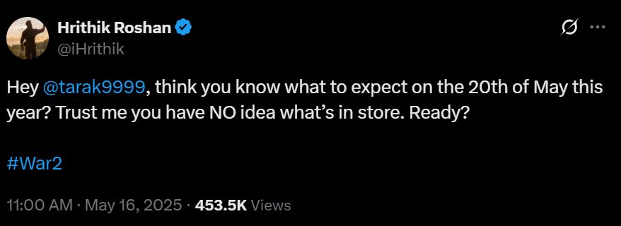Hrithik wrote on X, “Hey @tarak9999, think you know what to expect on the 20th of May this year? Trust me you have NO idea what’s in store. Ready? #War2.”