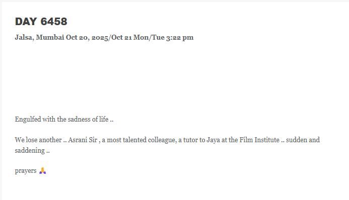 Megastar Amitabh Bachchan expressed profound sorrow over the demise of legendary actor Asrani. Taking to his blog, Big B penned emotional words in remembrance of his ‘Sholay’ colleague Asrani. “We lose another .. Asrani Sir , a most talented colleague, a tutor to Jaya at the Film Institute .. sudden and saddening ..,” Amitabh posted.
