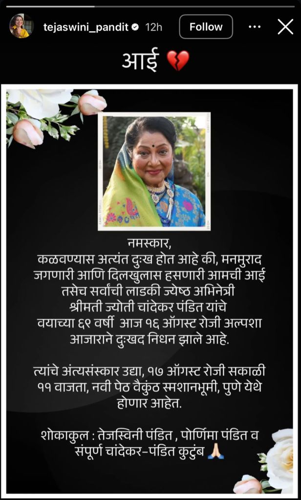 Her daughter, actress Tejaswini Pandit, confirmed the news and issued an official statement expressing her grief. In her note, Tejaswini mentioned that Jyoti Chandekar’s funeral will take place on August 17 at 11 a.m. at the Navi Peth Vaikunth Crematorium in Pune.