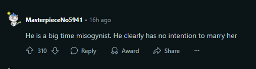 Another user criticized Aly calling him misogynist, “He is a big time misogynist. He clearly has no intention to marry her.”
