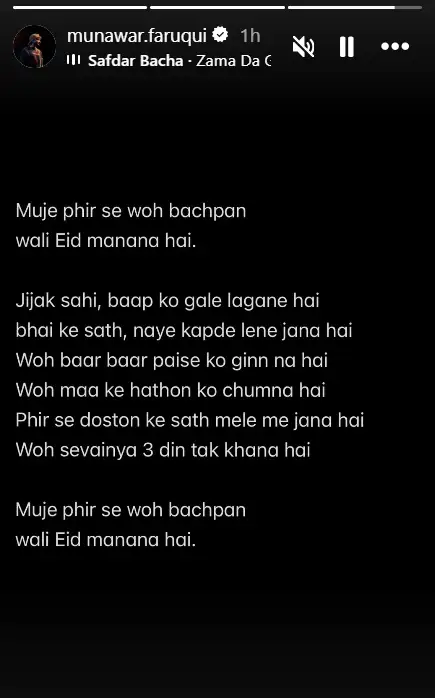 The stand- up comedian took to his Instagram and shared a heartfelt story this Eid. Munawar wrote, “Muje phir se woh bachpan wali Eid manana hai. Jijak sahi, baap ko gale lagane hai bhai ke sath, naye kapde lene jana hai Woh baar baar paise ko ginn na hai Woh maa ke hathon ko chumna hai Phir se doston ke sath mele me jana hai Woh sevainya 3 din tak khana hai Muje phir se woh bachpan wali Eid manana hai.”