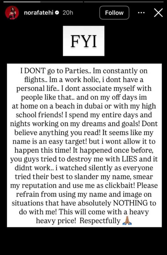 The actress took to her Instagram story to issue a firm and emotional response. In her statement, Nora wrote, “FYI. I DONT go to Parties.. Im constantly on flights.. Im a work holic, i dont have a personal life.. I dont associate myself with people like that.. and on my off days im at home on a beach in dubai or with my high school friends! I spend my entire days and nights working on my dreams and goals! Dont believe anything you read! It seems like my name is an easy target! but i wont allow it to happen this time! It happened once before, you guys tried to destroy me with LIES and it didnt work..”