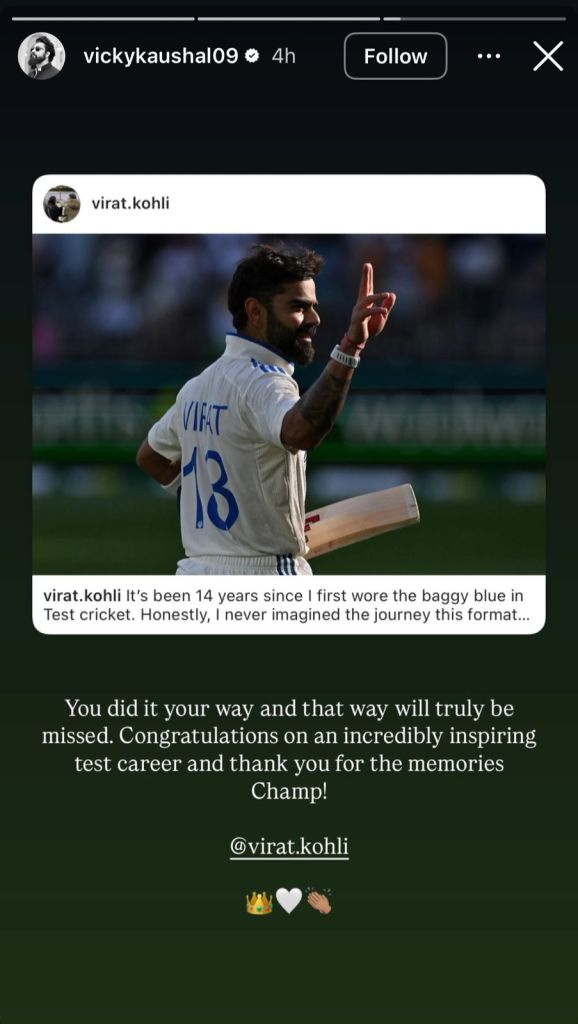 Vicky Kaushal, also expressed admiration for the former Test captain’s journey “You did it your way, and that way will truly be missed. Congratulations on an incredibly inspiring test career and thank you for the memories, Champ! @virat.kohli”.