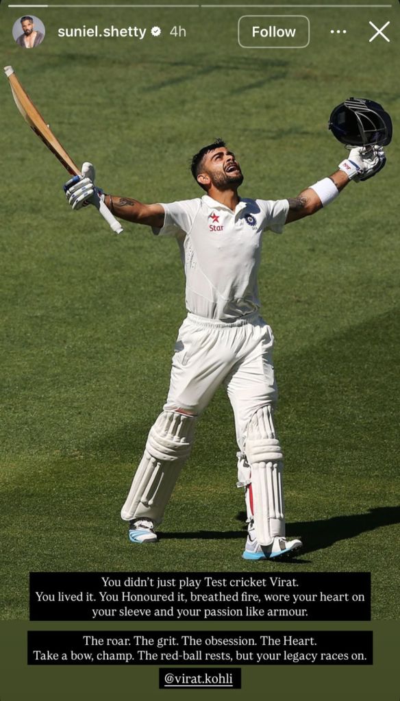 Among many celebs Suniel Shetty, penned a note on for Virat Kohli on Instagram stories “You didn’t just play Test cricket, Virat. You lived it. You honoured it, breathed fire, wore your heart on your sleeve, and your passion like armour.
