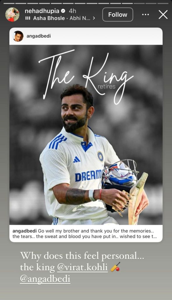 Dhupia’s husband, actor Angad Bedi, wrote a heartfelt message lovingly calling Kohli “Cheekoo.” “Go well my brother and thank you for the memories.. the tears.. the sweat and blood you have put in.. wished to see the 269 test cap go from the field.. test cricket will never be the same. I have a lump in my throat as i write this.. but you have set the bar way too high for someone to carry your legacy forward. Been wonderful to have known you personally.. and to have followed your career soo closely. God bless the KING @virat.kohli .Stay well my cheekoo.. love to the family. Waheguru chardikala vich rakhe humesha, love and prayers angad bedi.”