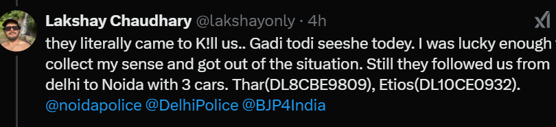 In the video, Lakshay Chaudhary recounted the terrifying incident, stating that a group of men followed his car from Delhi to Noida, wielding weapons and said ” They literally came to Kill us.. Gadi todi seeshe todey. I was lucky enough to collect my sense and got out of the situation. Still they followed us from delhi to Noida with 3 cars. “