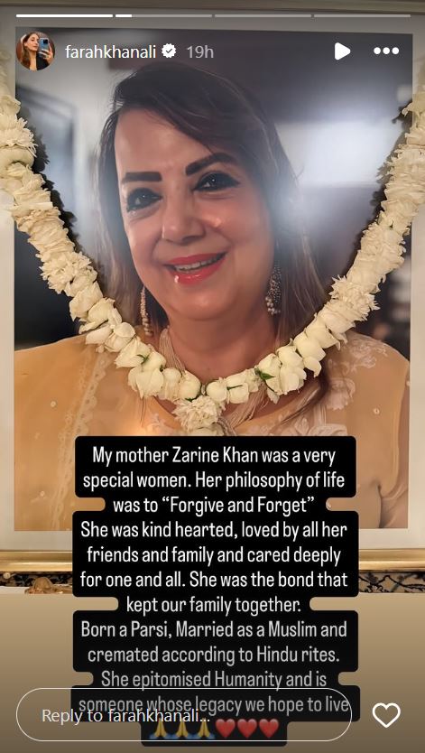 Her daughter Farah penned a heartfelt note on Instagram for her late mother. She wrote, “My mother, Zarine Khan, was a very special woman. Her philosophy of life was to ‘forgive and forget.’ She was kind-hearted, loved by all her friends and family, and cared deeply for everyone around her. Born a Parsi, married as a Muslim, and cremated according to Hindu rites — she epitomised humanity. She was the bond that held our family together, and her legacy is something we hope to live by.”