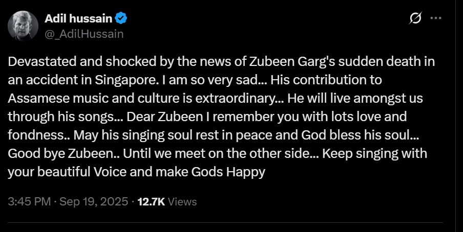 Actor Adil Hussain also expressed his grief and wrote, “Devastated and shocked by the news of Zubeen Garg’s sudden death in an accident in Singapore. I am so very sad… His contribution to Assamese music and culture is extraordinary… He will live amongst us through his songs… Dear Zubeen I remember you with lots love and fondness.. May his singing soul rest in peace and God bless his soul… Good bye Zubeen.. Until we meet on the other side… Keep singing with your beautiful Voice and make Gods Happy.”