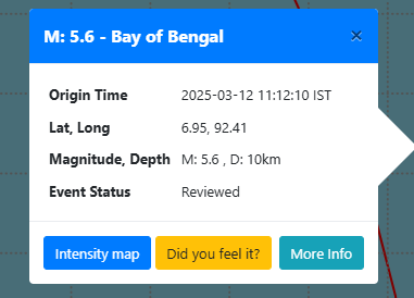 EQ of M: 5.6, On: 12/03/2025 11:12:10 IST, Lat: 6.95 N, Long: 92.41 E, Depth: 10 Km, Location: Bay of Bengal.
