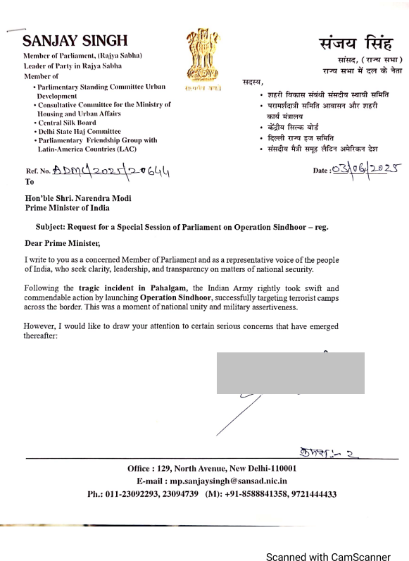 Sanjay Singh has said in the letter that he is writing this letter as a concerned MP and the voice of the public, which expects clarity, strong leadership and transparency in matters of national security. He mentioned that after the tragic incident in Pahalgam, the Indian Army launched ‘Operation Sindoor’, under which terrorist hideouts across the border were successfully targeted. He described it as a symbol of national unity and military firmness.