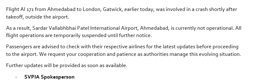 A statement released by SVPIA Spokesperson mentions, “Flight AI 171 from Ahmedabad to London Gatwick, earlier today, was involved in a crash shortly after takeoff, outside the airport. As a result, Sardar Vallabhbhai Patel International Airport, Ahmedabad, is currently not operational. All flight operations are temporarily suspended until further notice. Passengers are advised to check with their respective airlines for the latest updates before proceeding to the airport. We request your cooperation and patience as authorities manage this evolving situation. Further updates will be provided as soon as available”.