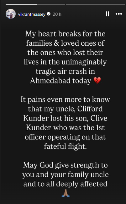 “My heart breaks for the families and loved ones of the ones who lost their lives in the unimaginably tragic air crash in Ahmedabad today. It pains even more to know that my uncle, Clifford Kunder, lost his son, Clive Kunder, who was the first officer operating on that fateful flight. May God give strength to you and your family, uncle, and to all [those] deeply affected,” actor Vikrant Massey wrote on Instagram on Thursday.
