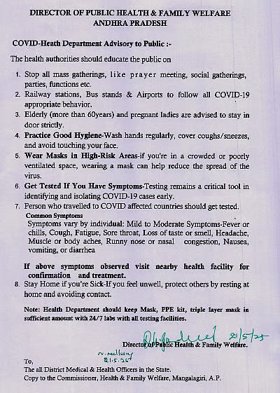 The Director of Public Health and Family Welfare in Andhra Pradesh called on the general public to practice good hygiene, which includes frequent handwashing; covering mouths and noses when coughing or sneezing; and avoiding touching the face. The government of Andhra Pradesh has also advised residents to wear masks in areas at risk, particularly in crowded or poorly-ventilated areas.
