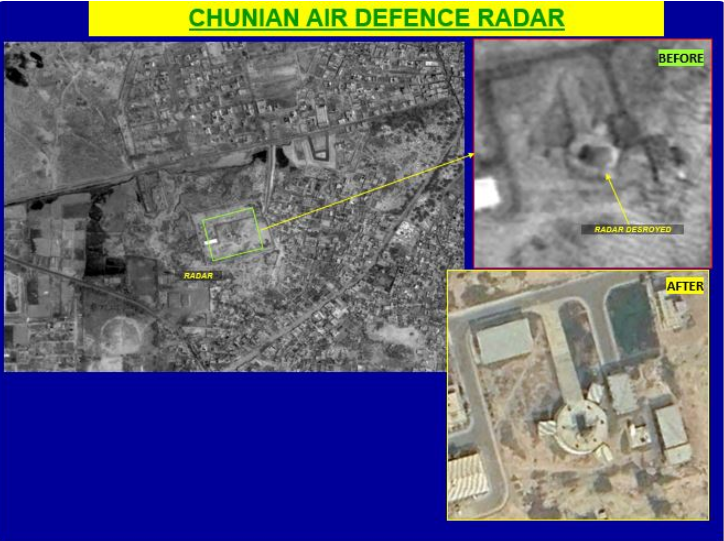 The targets included communication buildings, runways, operation centres, radar sites, aircraft hangars and shelters.