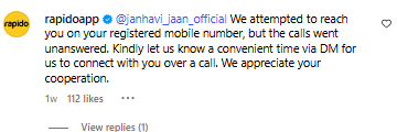 In a follow-up response, Rapido mentioned that they had attempted to contact Janhavi but had not received any reply from her. “Let us know a convenient time to connect over a call. We appreciate your cooperation.”