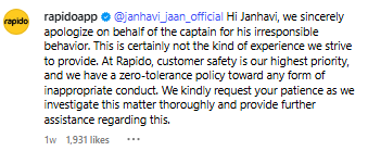 Responding to the viral post, Rapido said, “Hi Janhavi, we sincerely apologise on behalf of the captain. This is not the kind of experience we aim to provide. We take customer safety seriously and follow a zero-tolerance policy for such behaviour. Please allow us time to investigate.”