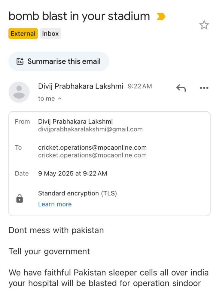 In yet another mail sent by the mail ID named ‘Divij Prabhakara Lakshmi’ to MPCA on May 9 at 9.22 am, the sender said, “Don’t mess with Pakistan. Tell your government, we have faithful Pakistan sleeper cells all over India. Your hospital will be blasted for Operation Sindhoor.” The title of the mail reads, “bomb blast in your stadium.”