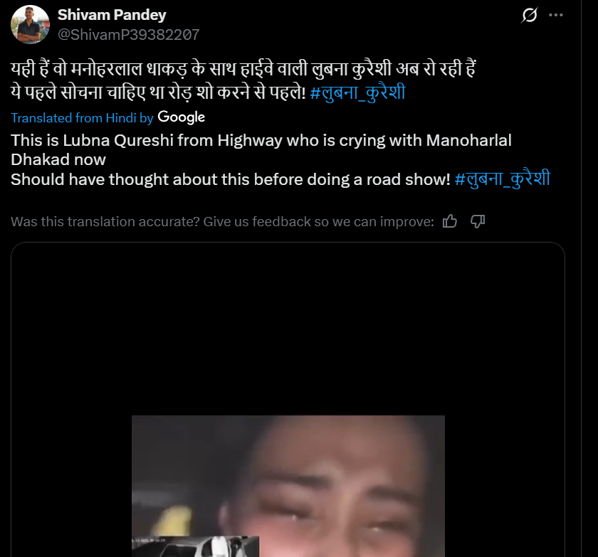 Meanwhile, another video shared by an X user featuring a Hijab-wearing woman is also not related to Lubna Qureshi in any way. It carries the caption, “मेरा जिस्म मेरी मर्जी, मै धन्दा करू तुम्हें क्या ? #LubnaQureshi हाइवे फिल्म की हीरोइन पर्दानशी लुबना कुरैशी को बेपर्दा ना कर दूं तो मेरा नाम मनोहर लाल धाकड़ नहीं।”