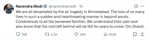 He also posted, “We are all devastated by the air tragedy in Ahmedabad. The loss of so many lives in such a sudden and heartbreaking manner is beyond words. Condolences to all the bereaved families. We understand their pain and also know that the void left behind will be felt for years to come. Om Shanti.”