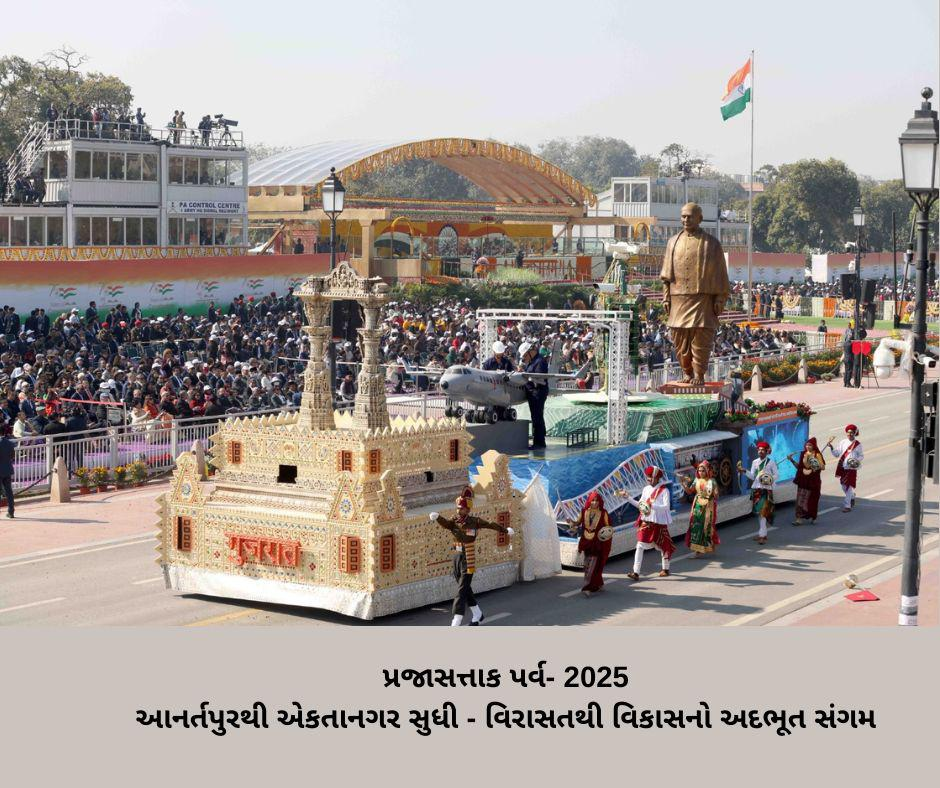 The Information Department of the Government of Gujarat has received the highest number of votes for its tableau “From Arantapur to Ektanagar – A Confluence of Heritage and Development” presented at this year’s parade. This remarkable achievement has earned Gujarat’s tableau first place in the Popular Choice category for the third consecutive year. Since its debut in the 74th Republic Day National Parade in 2023, Gujarat has set a new standard, leading the Popular Choice category. The first of these was the tableau “Clean Green Energy-rich Gujarat,” showcasing the state’s commitment to fulfilling the Prime Minister’s vision of maximizing renewable energy use. In the 75th Republic Day National Parade, Gujarat’s tableau “Dhordo, World’s Best Tourism Village-UNWTO” also claimed first place in the Popular Choice category. Additionally, this tableau secured second place in the Jury’s Choice for Excellence of Tableaus in 2024. Building on this legacy of excellence, Gujarat has now achieved an impressive hat-trick, securing first place for the third consecutive year in the 76th Republic Day National Parade. Presented on Kartavya Path in New Delhi, the tableau “Swarnim Bharat: Heritage and Development” eloquently portrayed the harmonious blend of cultural heritage and development, not only of Gujarat but of the entire nation.