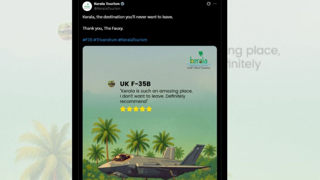Kerala’s tourism minister is using the F-35 jet situation to promote tourism. The tourism department even made an ad about it and shared it on their social media handle. People are sharing memes about it on social media. The jet has now become a brand ambassador for the state.