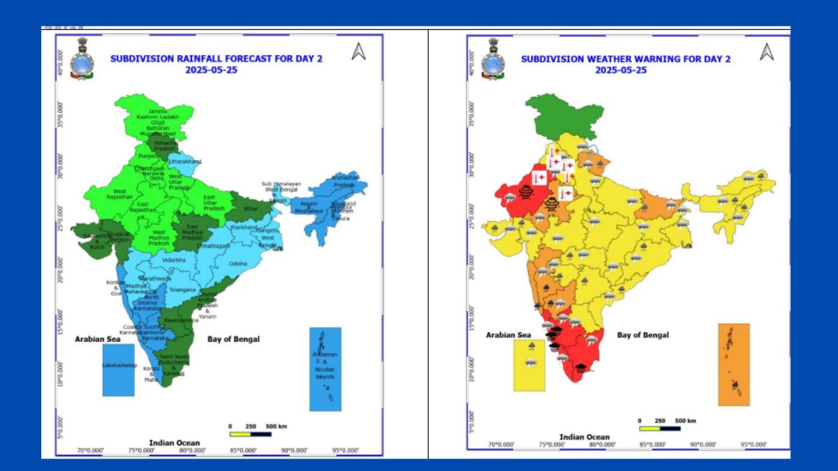 The India Meteorological Department (IMD) has forecast widespread rainfall, thunderstorms, and strong winds across several parts of India starting May 25, continuing through the end of the month. Several states across the southern, western, northeastern, eastern, and central regions are expected to witness moderate to heavy rainfall, with some areas likely to receive very heavy to extremely heavy downpours.