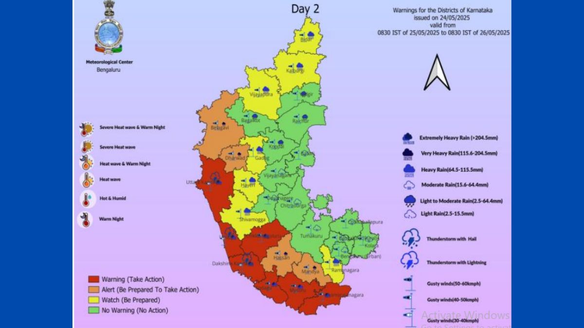 Heavy to very heavy rainfall is forecast over Kerala and Mahe from May 25 to 30, with extremely heavy rain at isolated places particularly likely on May 25 and 26. Similarly, Coastal and South Interior Karnataka will continue to receive heavy rainfall through May 27, intensifying further from May 28 to 30. North Interior Karnataka is also expected to receive heavy rainfall during this period.