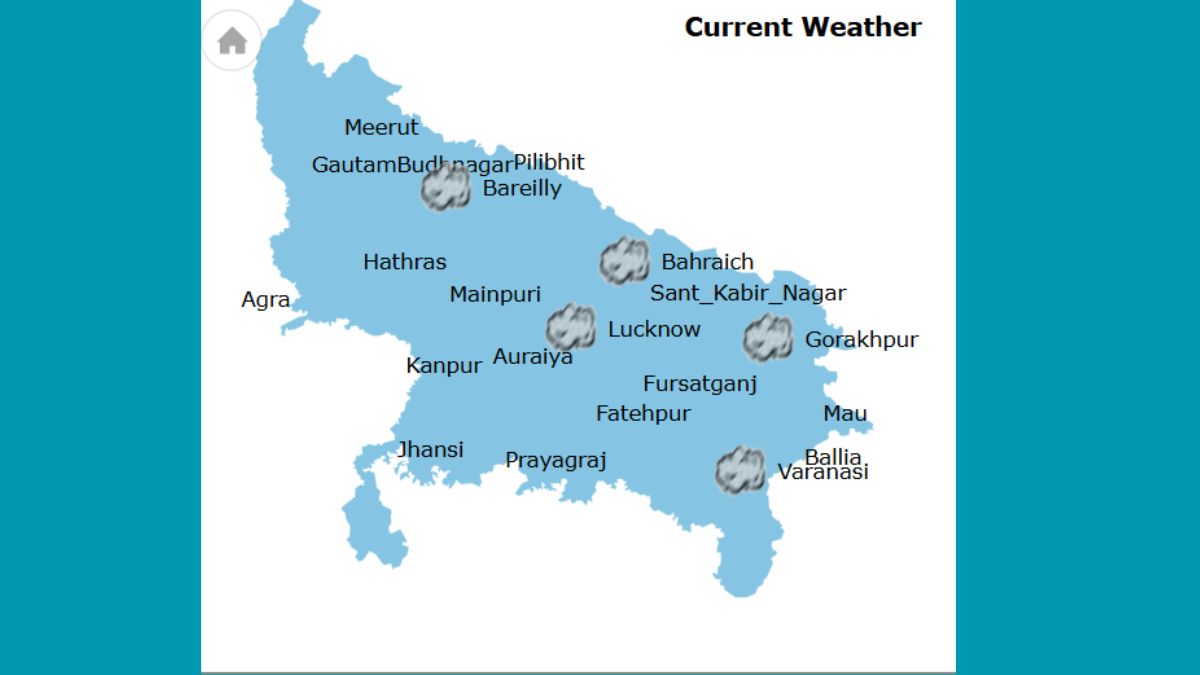 The IMD graphics for current weather over Uttar Pradesh shows rainy spell in several districts.