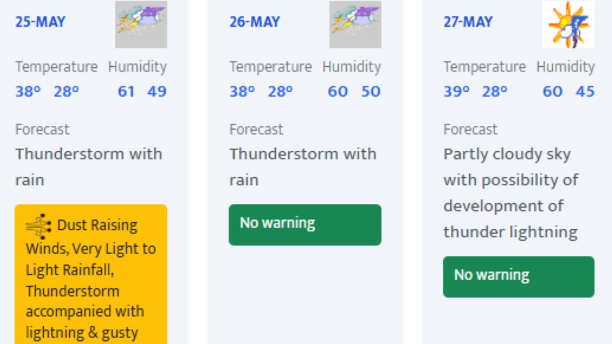 Dust Raising Winds, Very Light to Light Rainfall, Thunderstorm accompanied with lightning & gusty winds(40-50kmph) have been predicted over Delhi.