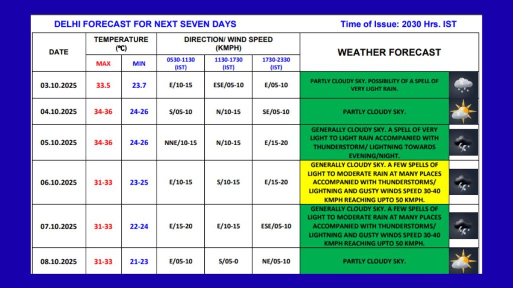 The IMD has forecast partly cloudy sky during next two days in the national capital. The sky will remain partly cloudy today, while a spell of very light rain/thunderstorm/lightning towards afternoon/evening is predicted on October 5. The minimum and maximum temperatures are expected in the range of 22-24°C and 34-36°C respectively over Delhi.
